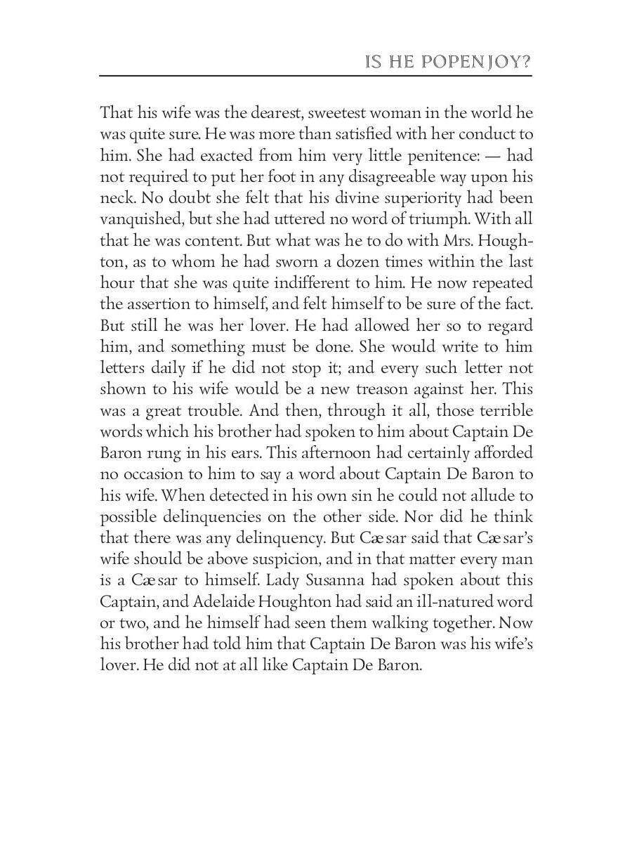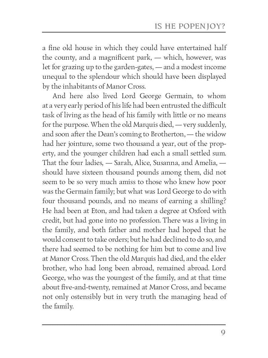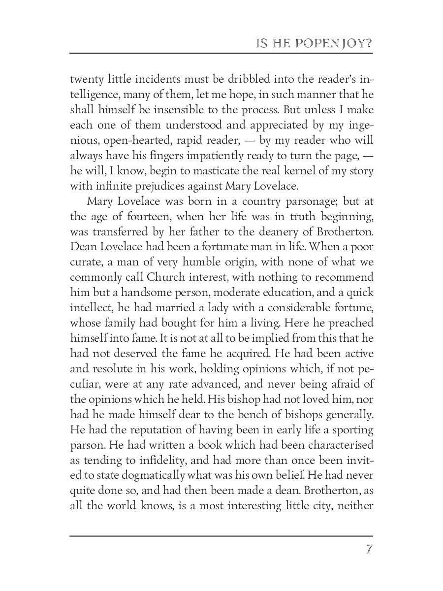 Handling time: 19 days Автор: Trollope A., «Is He Popenjoy? 1»: Anthony Trollope (1815 — 1882) was an English novelist of the Victorian era. Among his best-known works is a series of novels collectively known as the Chronicles of Barsetshire, which revolves around the imaginary county of Barsetshire. "Is He Popenjoy?" is a comic novel, which tells a story of the Marquis of Brotherton who returns to England from Italy with an Italian wife and small child who he claims as his heir, Lord Popenjoy. The plot explores, among other things the question of legitimacy and also that of the power struggles between husband and wife — a topic frequently visited by Trollope.