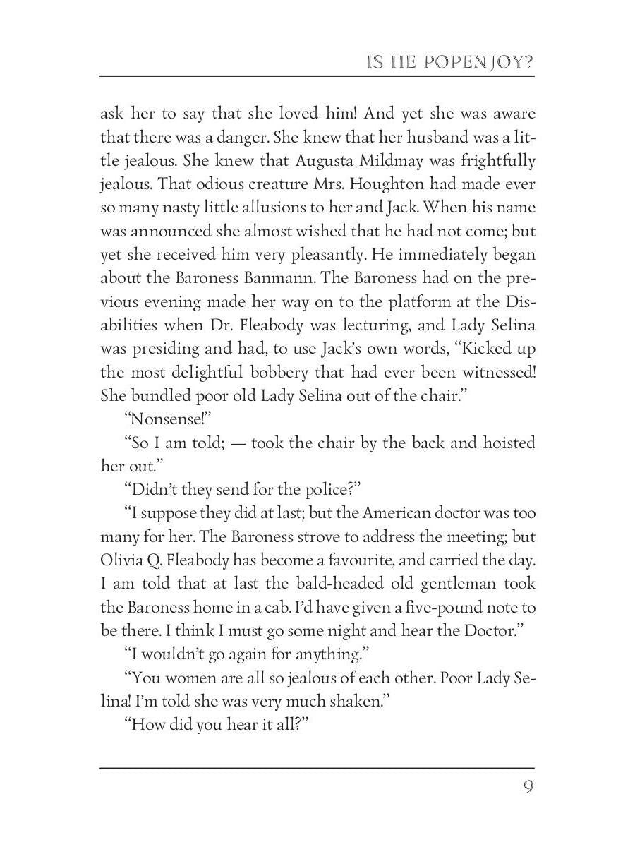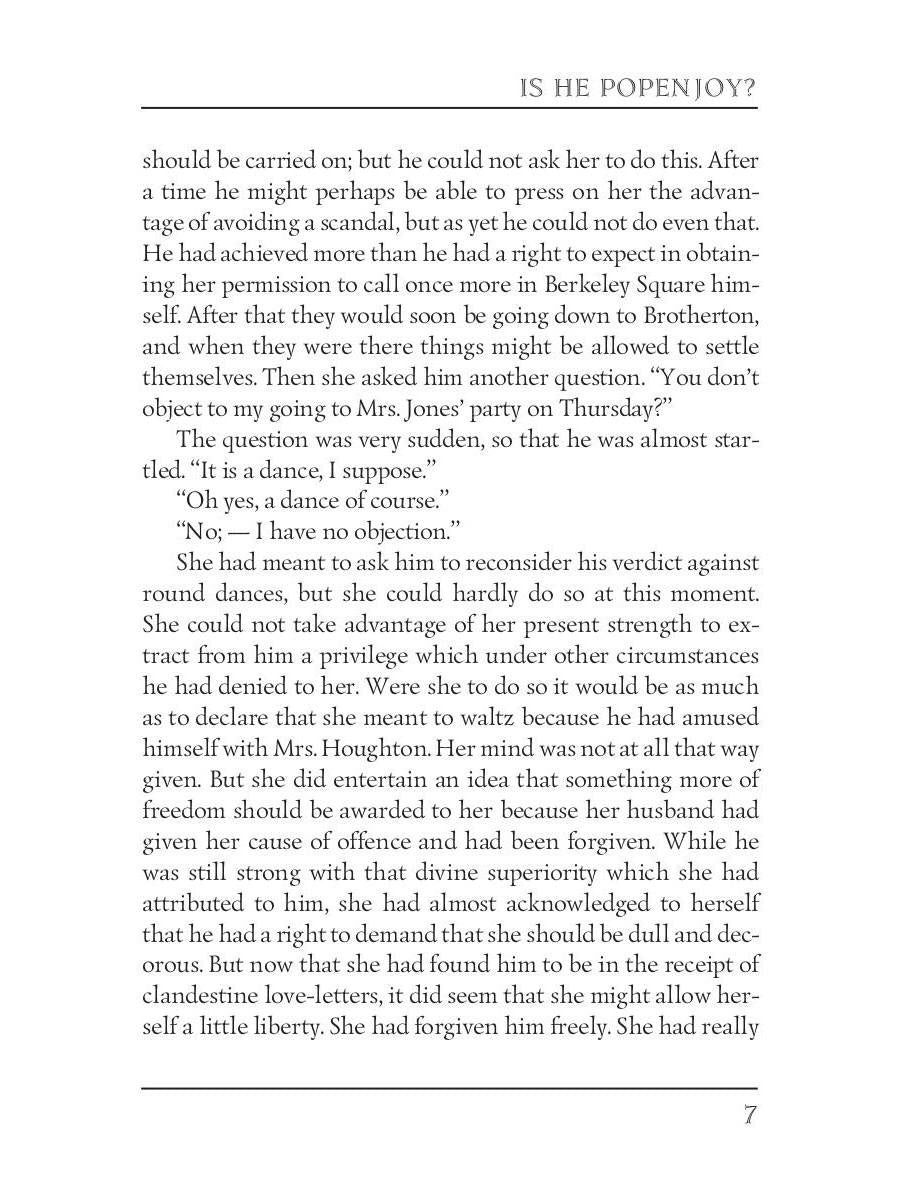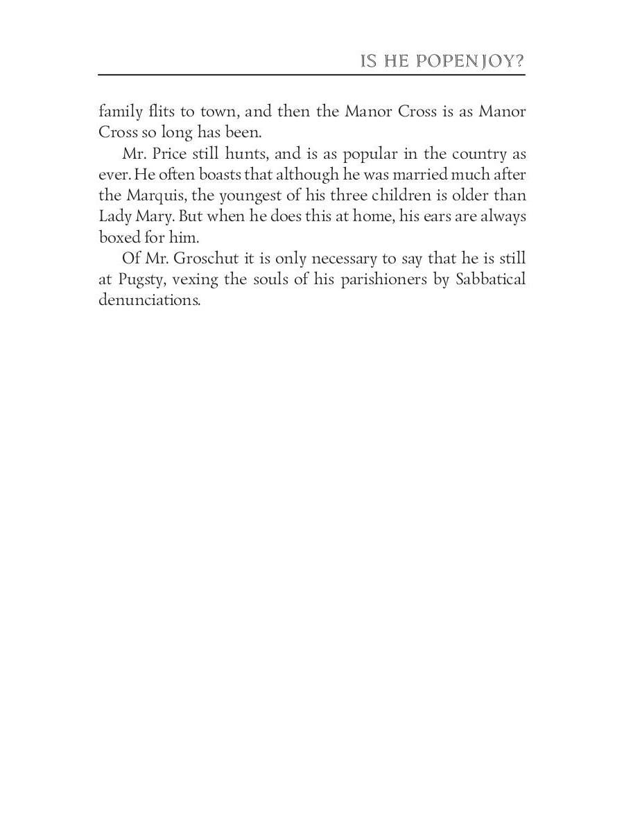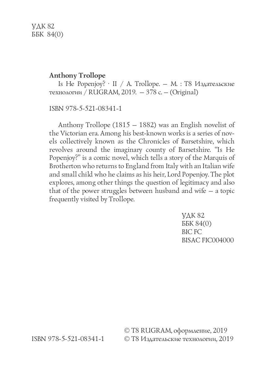 Handling time: 19 days Автор: Trollope A., «Is He Popenjoy? 2»: Anthony Trollope (1815 — 1882) was an English novelist of the Victorian era. Among his best-known works is a series of novels collectively known as the Chronicles of Barsetshire, which revolves around the imaginary county of Barsetshire. "Is He Popenjoy?" is a comic novel, which tells a story of the Marquis of Brotherton who returns to England from Italy with an Italian wife and small child who he claims as his heir, Lord Popenjoy. The plot explores, among other things the question of legitimacy and also that of the power struggles between husband and wife — a topic frequently visited by Trollope.
