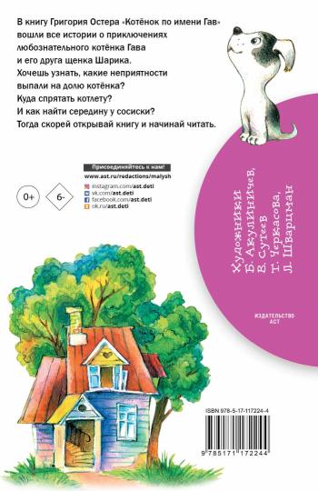 Handling time: 14 days В книгу Григория Остера «Котёнок по имени Гав» вошли все истории о приключениях любознательного котёнка с необычным именем и его друга — щенка Шарика. Гав постоянно попадает в нелепые ситуации и находит приключения сразу, как только выходит из дома. Он не боится неприятностей, знает, где середина у сосиски, может объяснить для чего нужен cекретный язык и почему бояться грозы веселей вместе с другом. Сказочные истории повествуют о настоящей дружбе и учат проявлять заботу по отношению к окружающим. Художники Б. Акулиничев, В. Сутеев, Т. Черкасова, Л. Шварцман. Для младшего школьного возраста.