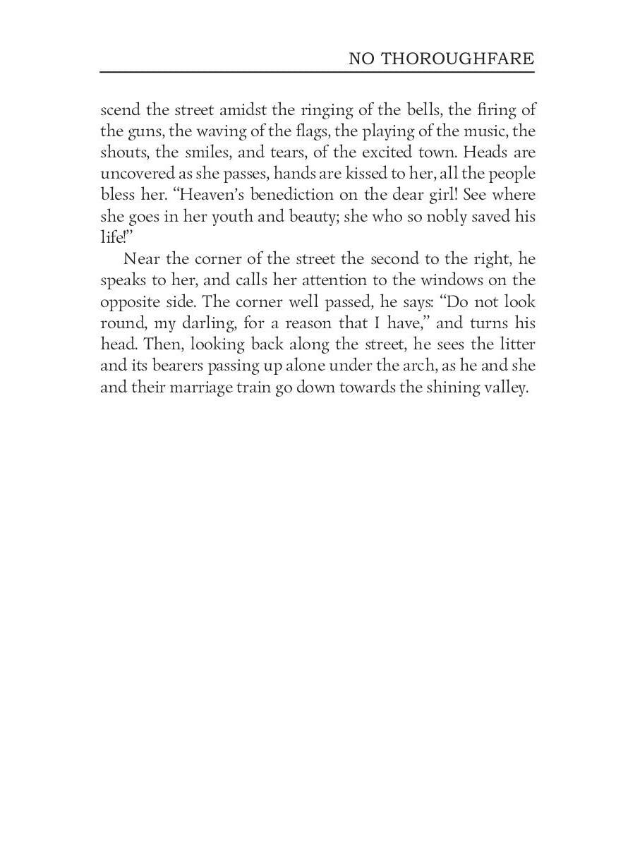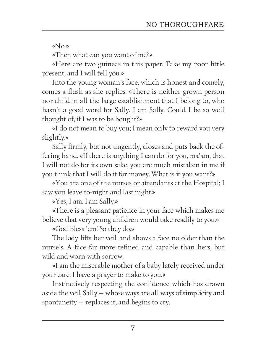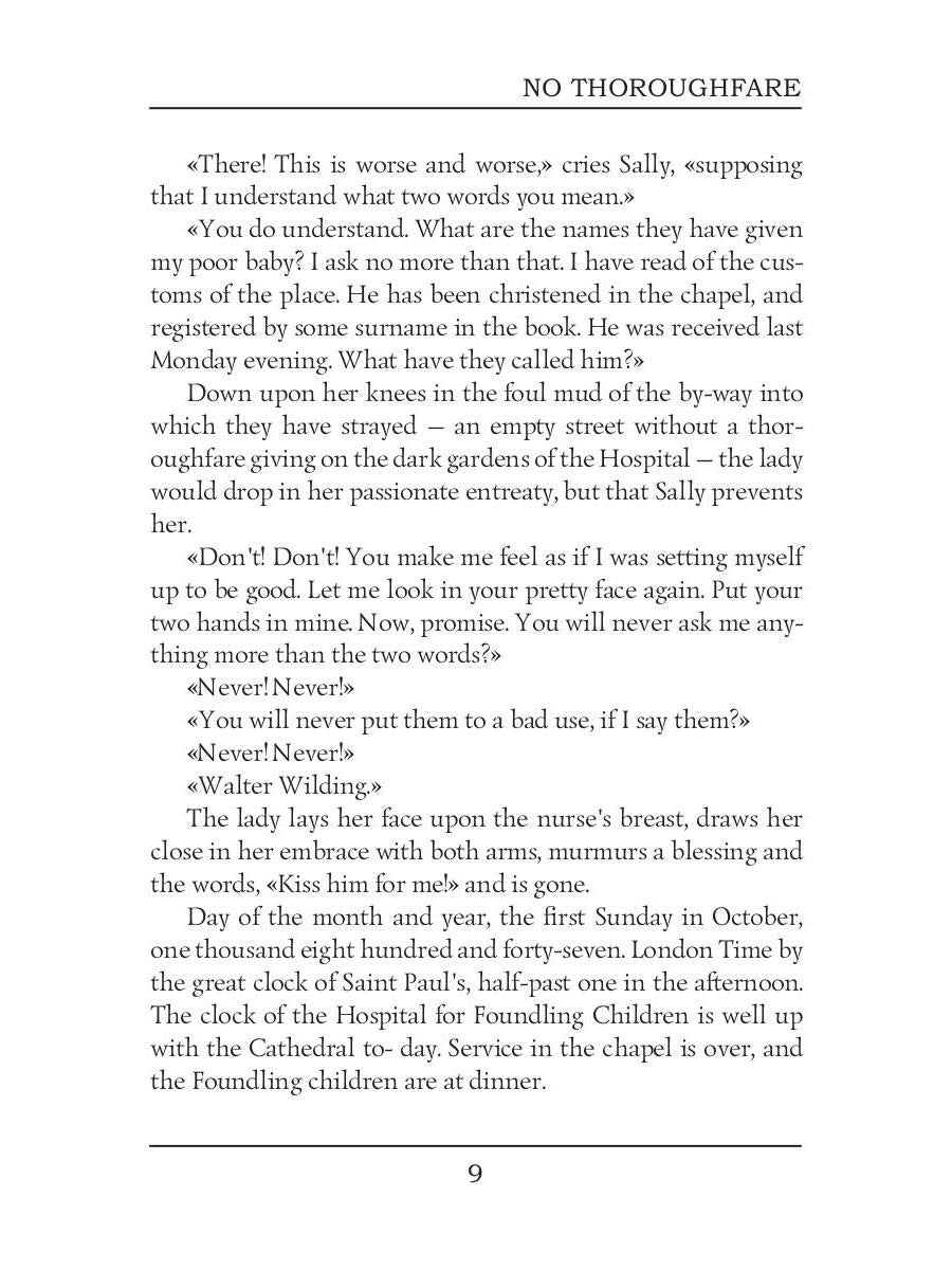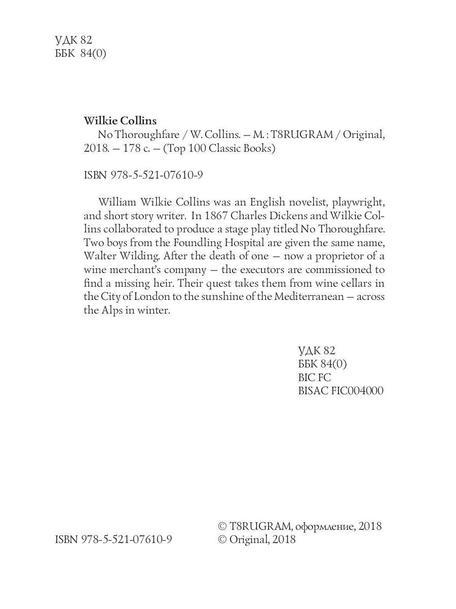 Handling time: 19 days Автор: Collins William Wilkie, «No Thoroughfare = В тупике (на английском языке)»: William Wilkie Collins was an English novelist, playwright, and short story writer. In 1867 Charles Dickens and Wilkie Collins collaborated to produce a stage play titled No Thoroughfare. Two boys from the Foundling Hospital are given the same name, Walter Wilding. After the death of one — now a proprietor of a wine merchant's company — the executors are commissioned to find a missing heir. Their quest takes them from wine cellars in the City of London to the sunshine of the Mediterranean — across the Alps in winter.