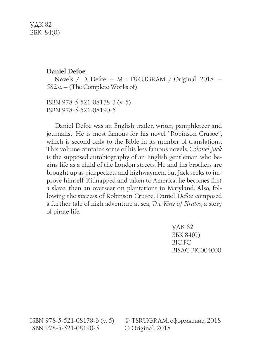 Handling time: 19 days Автор: Defoe Daniel, «Novels = Рассказы. Т. 5: на англ.яз»: Daniel Defoe was an English trader, writer, pamphleteer and journalist. He is most famous for his novel "Robinson Crusoe", which is second only to the Bible in its number of translations. This volume contains some of his less famous novels. Colonel Jack is the supposed autobiography of an English gentleman who begins life as a child of the London streets. He and his brothers are brought up as pickpockets and highwaymen, but Jack seeks to improve himself. Kidnapped and taken to America, he becomes first a slave, then an overseer on plantations in Maryland. Also, following the success of Robinson Crusoe, Daniel Defoe composed a further tale of high adventure at sea, The King of Pirates, a story of pirate life.