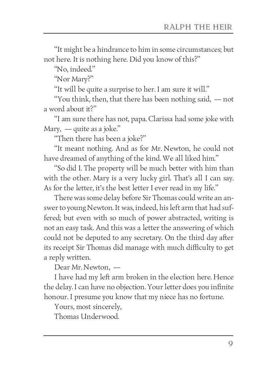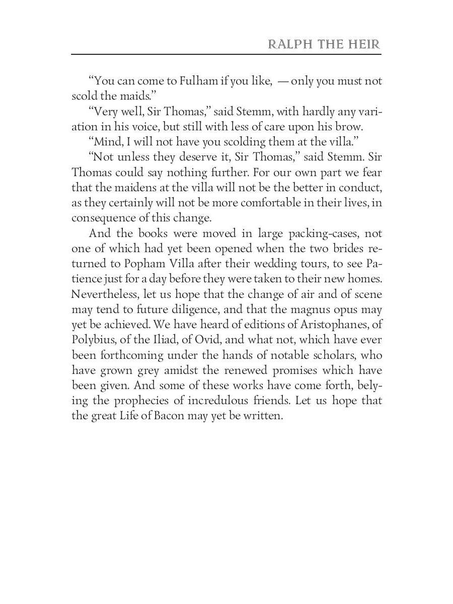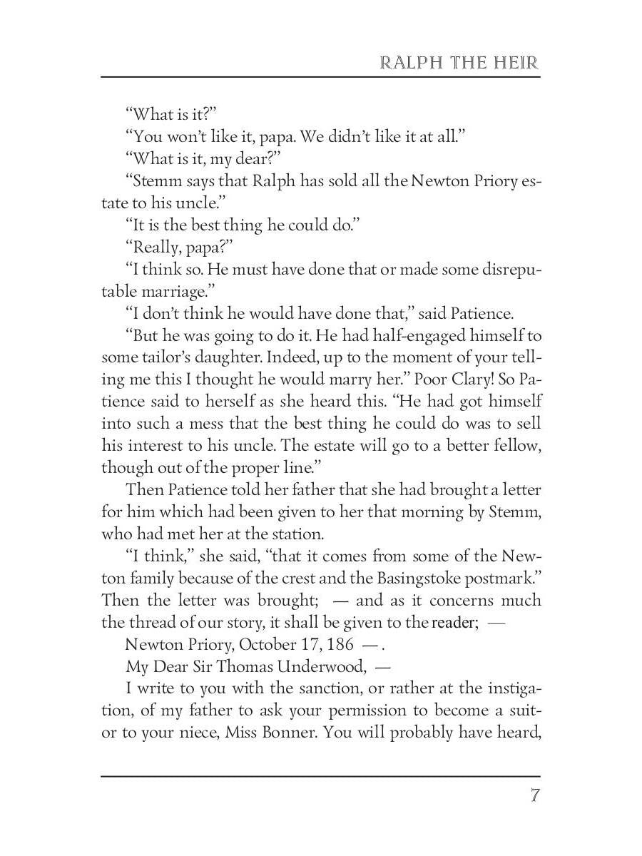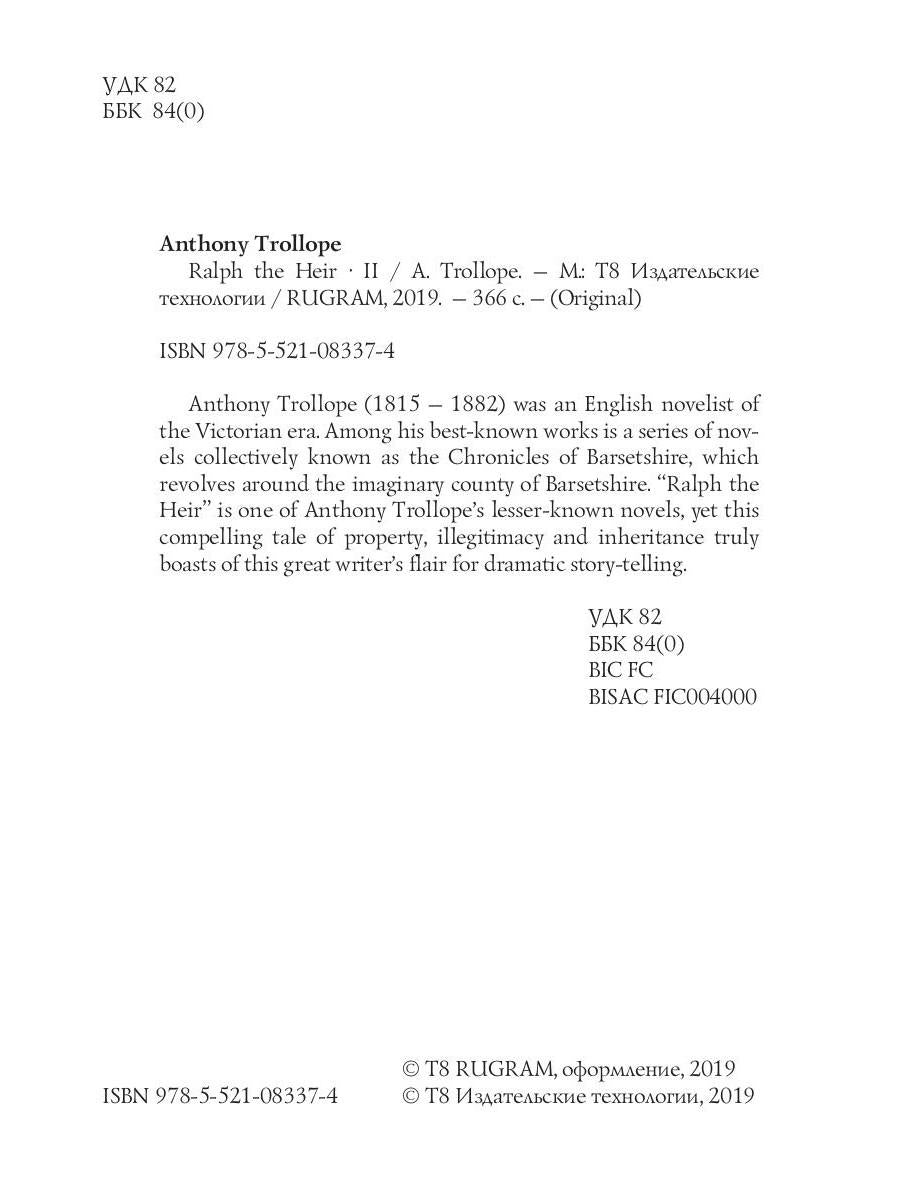 Handling time: 19 days Автор: Trollope A., «Ralph the Heir 2»: Anthony Trollope (1815 — 1882) was an English novelist of the Victorian era Among his best-known works is a series of novels collectively known as the Chronicles of Barsetshire, which revolves around the imaginary county of Barsetshire. "Ralph the Heir" is one of Anthony Trollope's lesser-known novels, yet this compelling tale of property, illegitimacy and inheritance truly boasts of this great writer's flair for dramatic story-telling.