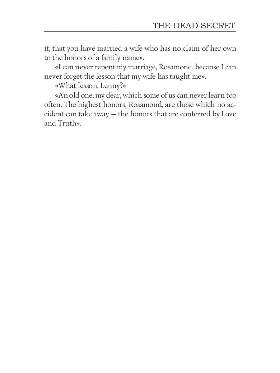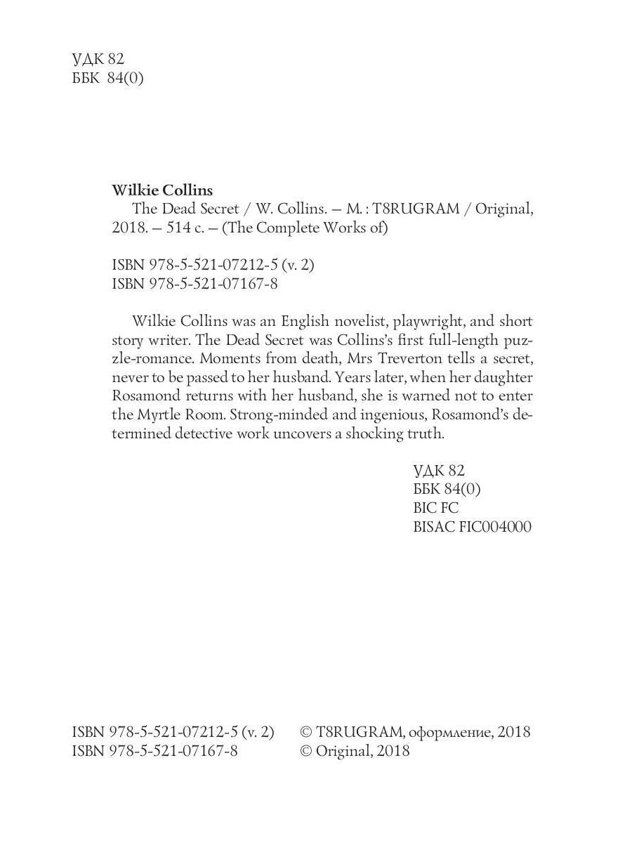 Handling time: 19 days Автор: Collins William Wilkie, «The Dead Secret = Тайна (на английском языке)»: Wilkie Collins was an English novelist, playwright, and short story writer. The Dead Secret was Collins's first full-length puzzle-romance. Moments from death, Mrs Treverton tells a secret, never to be passed to her husband. Years later, when her daughter Rosamond returns with her husband, she is warned not to enter the Myrtle Room. Strong-minded and ingenious, Rosamond's determined detective work uncovers a shocking truth.