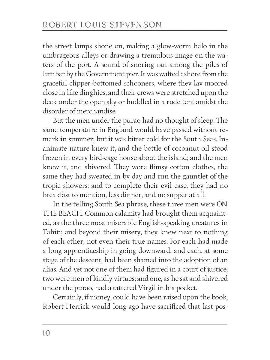 Handling time: 19 days Автор: Stevenson R.L., «The Ebb-Tide = Морской Отлив: на англ.яз»: Robert Louis Stevenson (1850—1894) was a Scottish novelist, poet, travel writer, and essayist. He was a celebrity during his lifetime for works like "Strange Case of Dr. Jekyll and Mr. Hyde" and "Treasure Island." Now he is one of the most translated authors in the world. "The Ebb-Tide" is a short novel co-written by Stevenson and his stepson Lloyd Osbourne. The plot revolves around three men down on their luck in Tahiti. All of them agree to ship out on a vessel whose officers died of smallpox, but on the way, they decide to steal the ship and its cargo. Naturally, this doesn't end well.