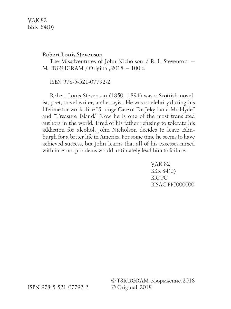 Handling time: 19 days Автор: Stevenson R.L., «The Misadventures of John Nicholson = Несчастья Джона Никольсона: на англ.яз»: Robert Louis Stevenson (1850—1894) was a Scottish novelist, poet, travel writer, and essayist. He was a celebrity during his lifetime for works like "Strange Case of Dr. Jekyll and Mr. Hyde" and "Treasure Island." Now he is one of the most translated authors in the world. Tired of his father refusing to tolerate his addiction for alcohol, John Nicholson decides to leave Edinburgh for a better life in America. For some time he seems to have achieved success, but John learns that all of his excesses mixed with internal problems would ultimately lead him to failure.