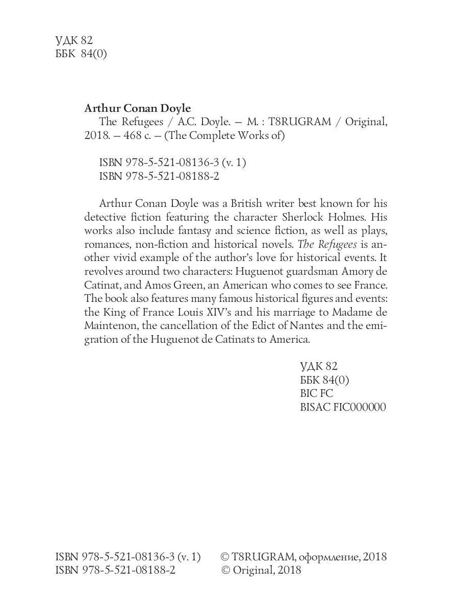Handling time: 19 days Автор: Doyle Arthur Conan, «The Refugees = Изгнанники: на англ.яз»: Arthur Conan Doyle was a British writer best known for his detective fiction featuring the character Sherlock Holmes. His works also include fantasy and science fiction, as well as plays, romances, non-fiction and historical novels. The Refugees is another vivid example of the author's love for historical events. It revolves around two characters: Huguenot guardsman Amory de Catinat, and Amos Green, an American who comes to see France. The book also features many famous historical figures and events: the King of France Louis XIV's and his marriage to Madame de Maintenon, the cancellation of the Edict of Nantes and the emigration of the Huguenot de Catinats to America