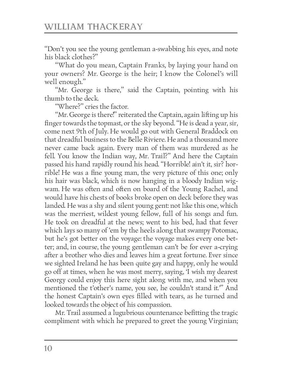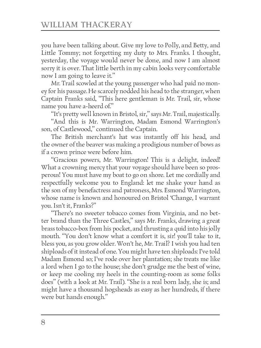Handling time: 19 days Автор: Thackeray W., «The Virginians 1 = Виргинцы: рассказ о последнем веке 1: на англ.яз»: William Makepeace Thackeray (1811—1863) was a British author and novelist mostly known for his satirical works such as "Vanity Fair" that showed an ironic representation of the British society of those times. "The Virginians" is a historical novel, a sequel to "The History of Henry Esmond, Esq" loosely linked to "The History of Pendennis." It tells the story of Henry Esmond's twin grandsons, George and Henry Warrington. Henry's romantic connection with an older woman makes him join the British army and fight under the command of General Wolfe during the capture of Quebec. During the American War of Independence, he takes the revolutionary side. This event forces George, who is also a British officer, to resign rather than go into battle against his brother.
