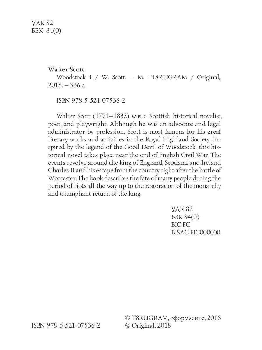 Handling time: 19 days Автор: Scott W., «Woodstock 1 = Вудсток 1: на англ.яз»: Walter Scott (1771—1832) was a Scottish historical novelist, poet, and playwright. Although he was an advocate and legal administrator by profession, Scott is most famous for his great literary works and activities in the Royal Highland Society. Inspired by the legend of the Good Devil of Woodstock, this historical novel takes place near the end of English Civil War. The events revolve around the king of England, Scotland and Ireland Charles II and his escape from the country right after the battle of Worcester. The book describes the fate of many people during the period of riots all the way up to the restoration of the monarchy and triumphant return of the king.