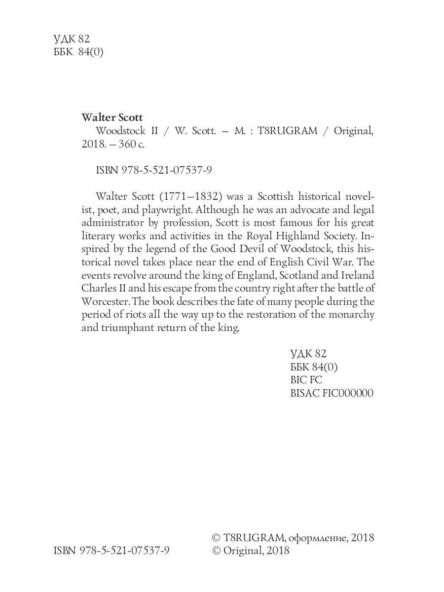 Handling time: 19 days Автор: Scott W., «Woodstock 2 = Вудсток 2: на англ.яз»: Walter Scott (1771-1832) was a Scottish historical novelist, poet, and playwright. Although he was an advocate and legal administrator by profession, Scott is most famous for his great literary works and activities in the Royal Highland Society. Inspired by the legend of the Good Devil of Woodstock, this historical novel takes place near the end of English Civil War. The events revolve around the king of England, Scotland and Ireland Charles II and his escape from the country right after the battle of Worcester. The book describes the fate of many people during the period of riots all the way up to the restoration of the monarchy and triumphant return of the king.